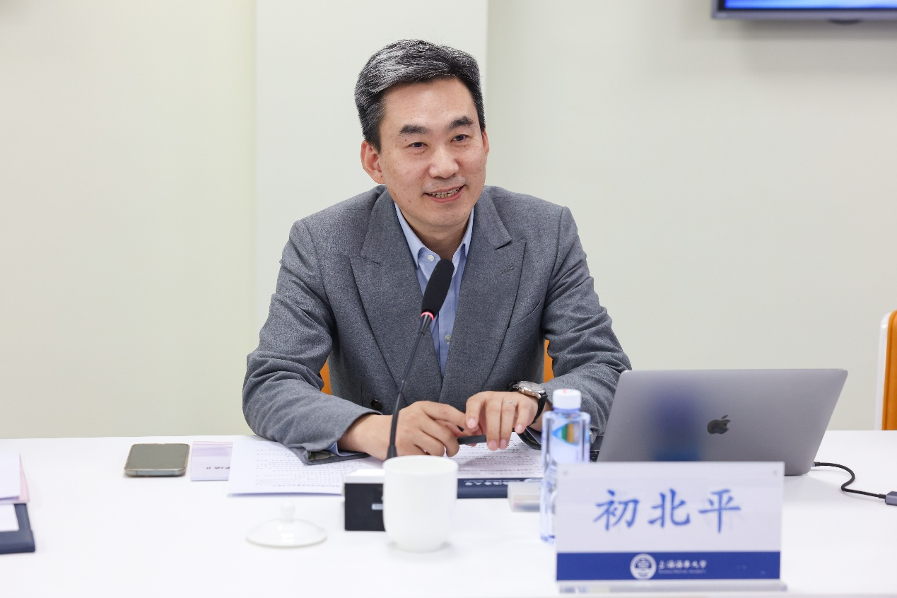 初北平代表学校致欢迎辞,感谢最高法院民四庭对学校的指导和帮助,他表示学校能与最高人民法院一起深度参与《海商法》修订,是一次难得的学习机会,也将继续积极参与新《海商法》的司法解释及《海事诉讼特别程序法》的修订。
