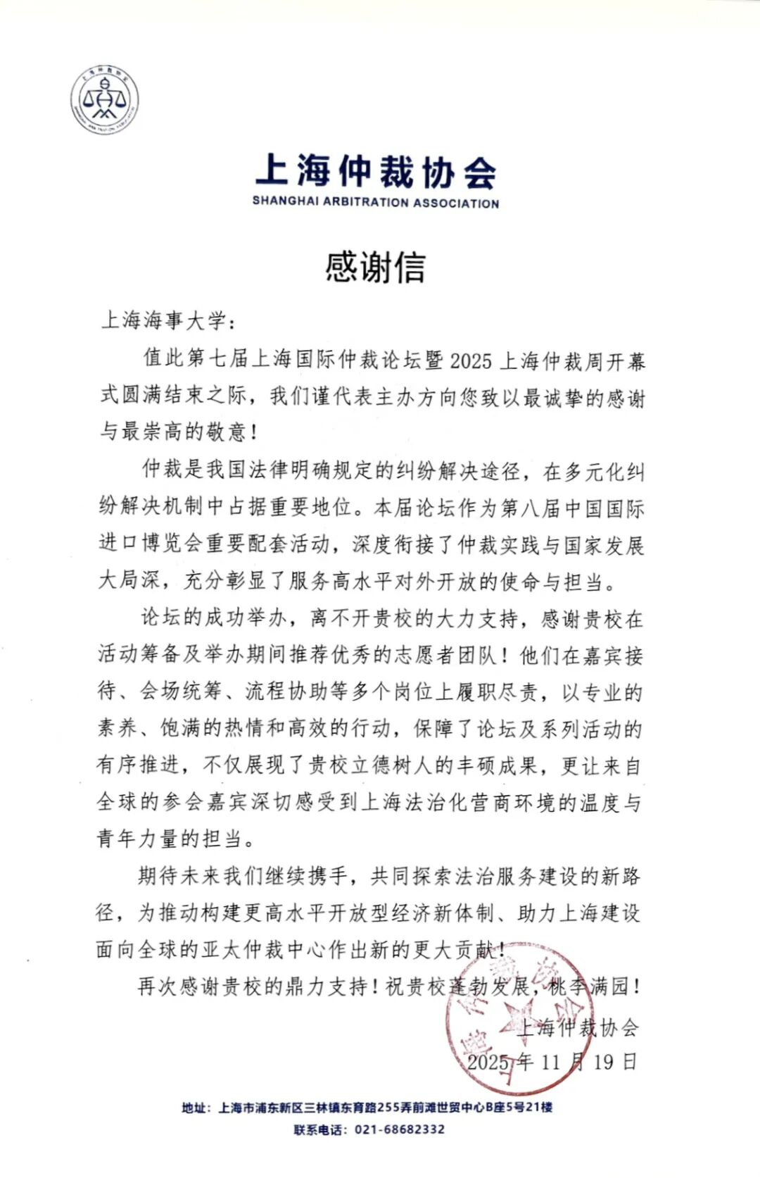 近日,学院收到上海仲裁协会发来的感谢信。对学院在第七届上海国际仲裁论坛暨2025上海仲裁周开幕式期间所作的工作和提供的大力支持表示衷心感谢。
