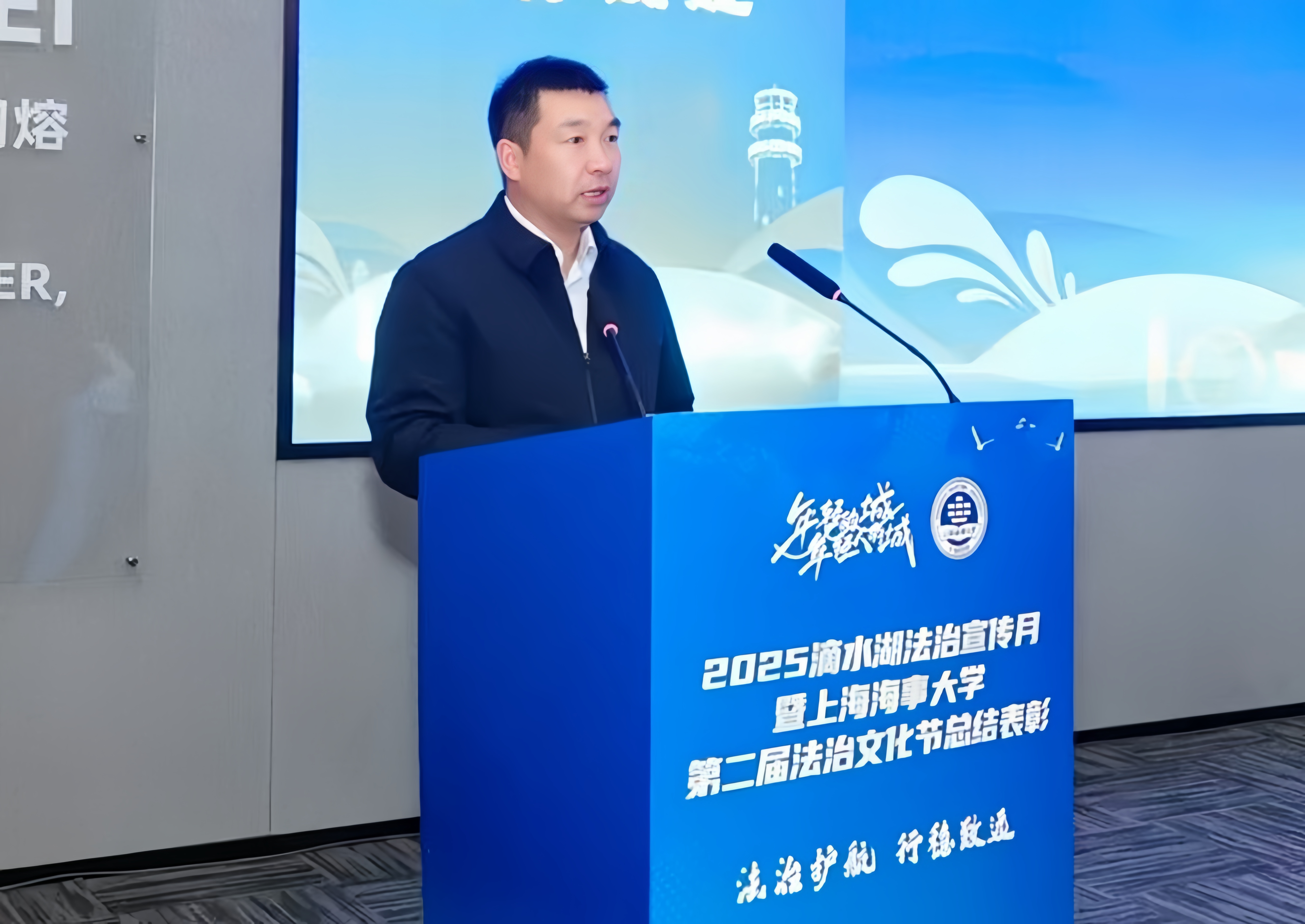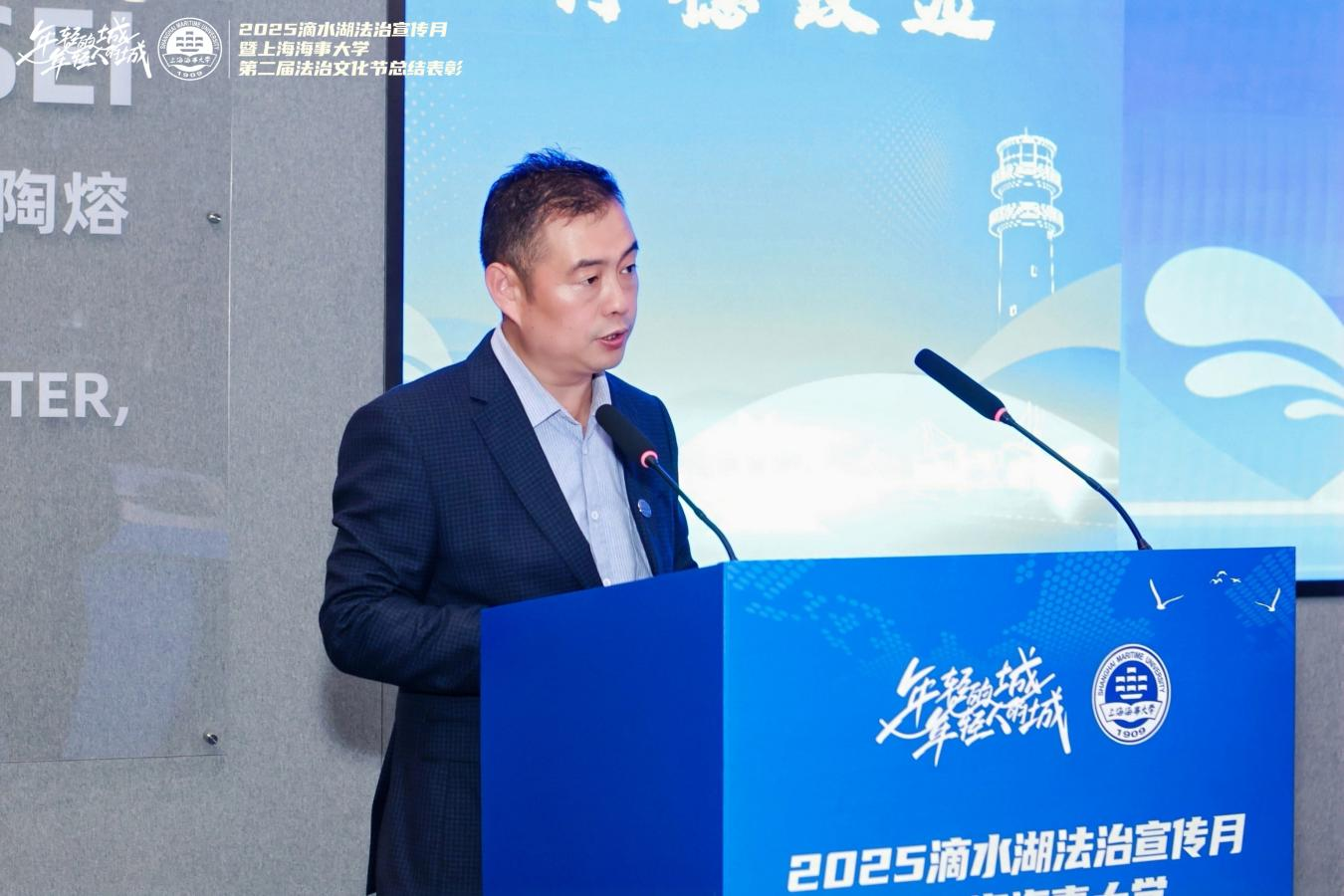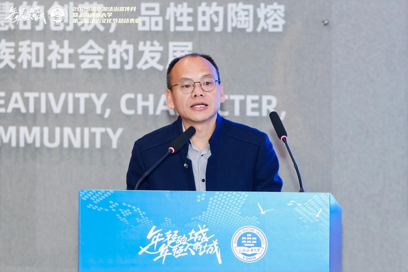 12月9日,由临港新片区管委会、浦东新区司法局与上海海事大学联合主办,上海海事大学法学院、上海科技法律联盟共同承办的“2025滴水湖法治宣传月暨上海海事大学第二届法治文化节”总结表彰大会在临港新片区顺利举行。上海市司法局、浦东新区司法局、临港新片区管委会等单位相关领导,以及驻区法治机构、法律服务机构、法律服务券企业、国际组织及社区代表等共同参与。学校党委副书记、副校长李志鹏出席并致辞。