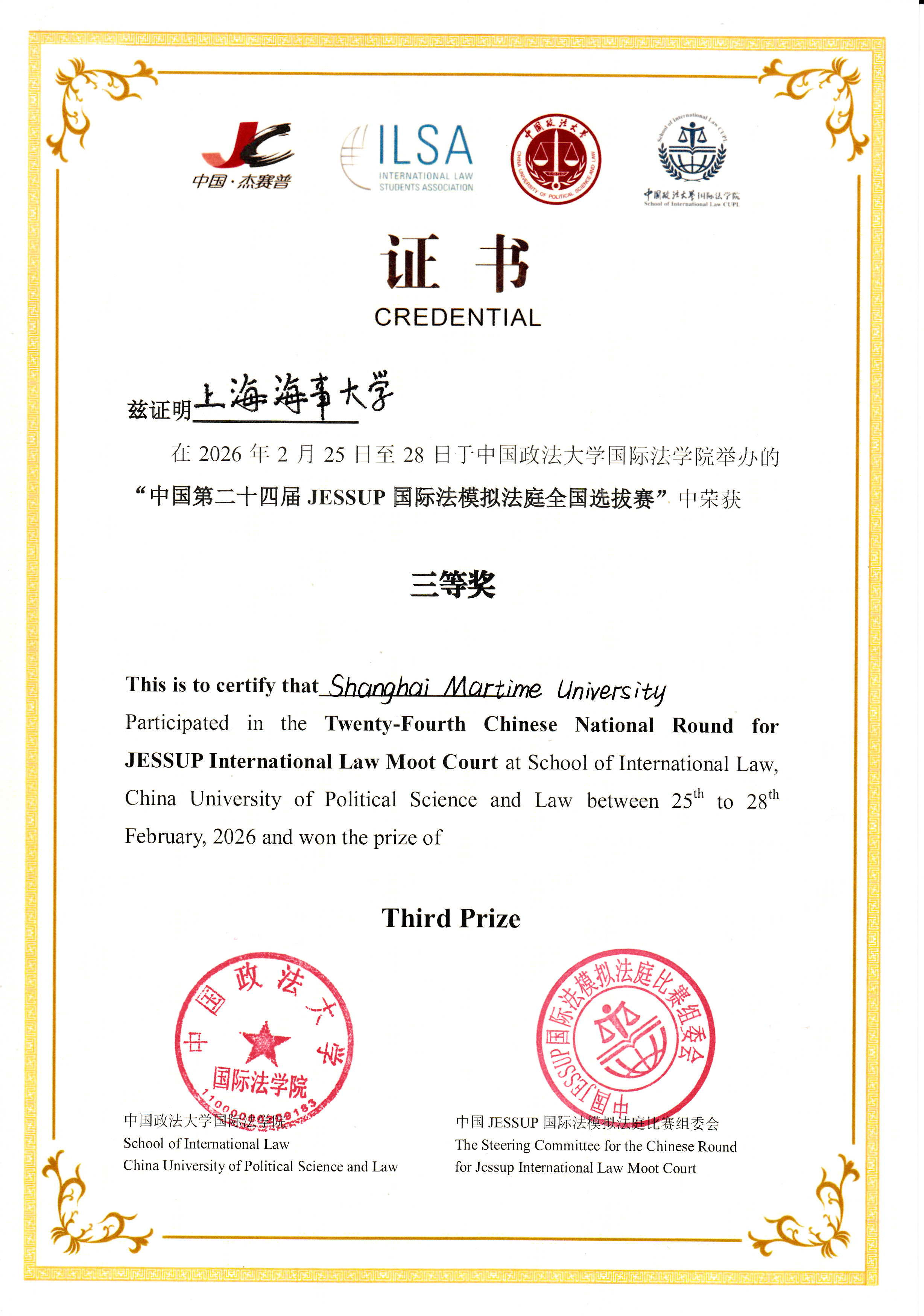 2月24日至28日,第24届“杰赛普”(Jessup)国际法模拟法庭大赛中国赛区比赛在中国政法大学举行。学校代表队凭借扎实的国际法理论基础、严谨的法律论证及出色的庭辩能力荣获全国三等奖。